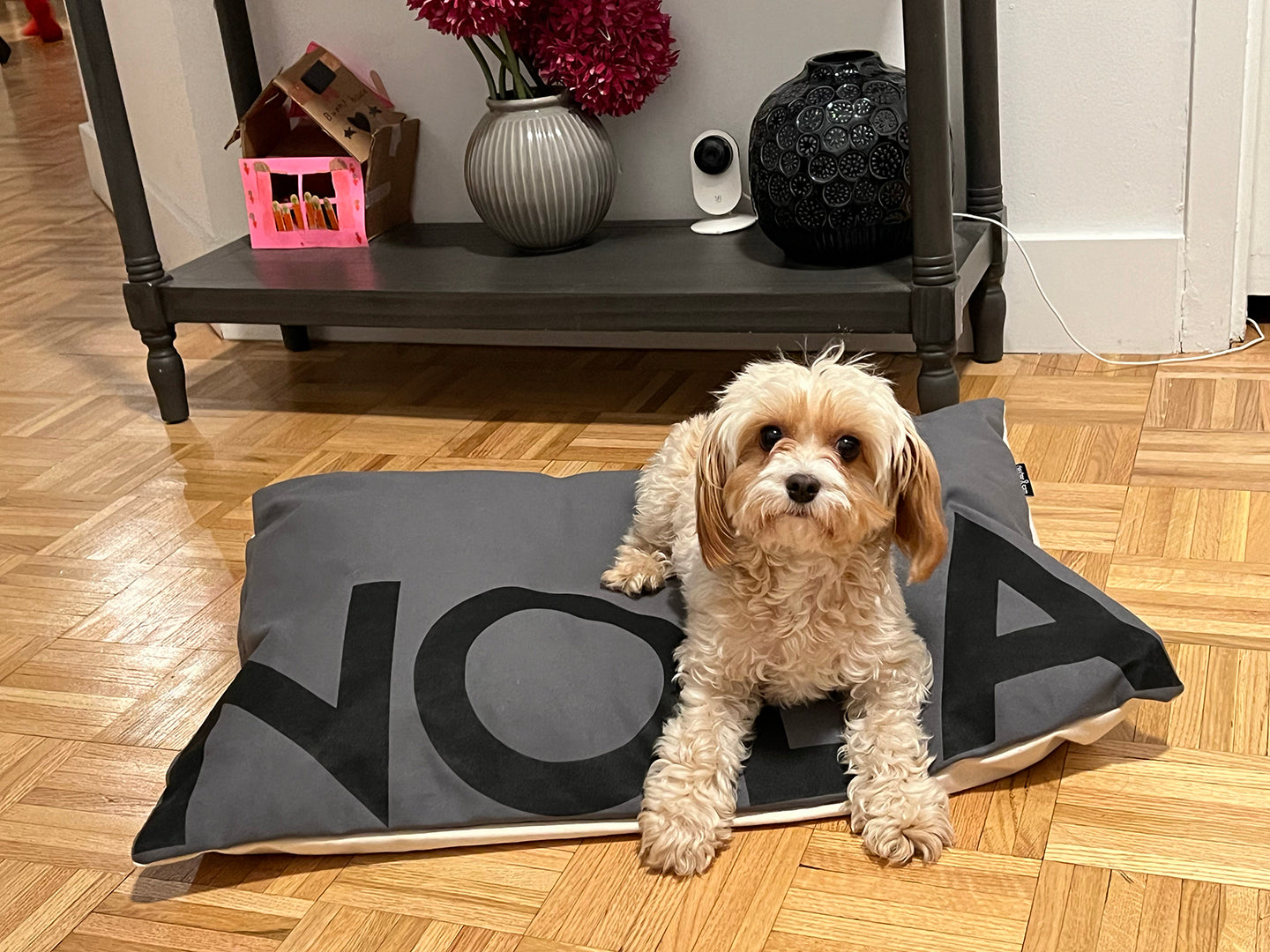 Nola takes her job of protecting her new hand-printed dog bed very seriously. She positions herself in front of it whenever someone enters the room. At night, she curls up on the bed, keeping a watchful eye ensuring it stays safe and secure.
